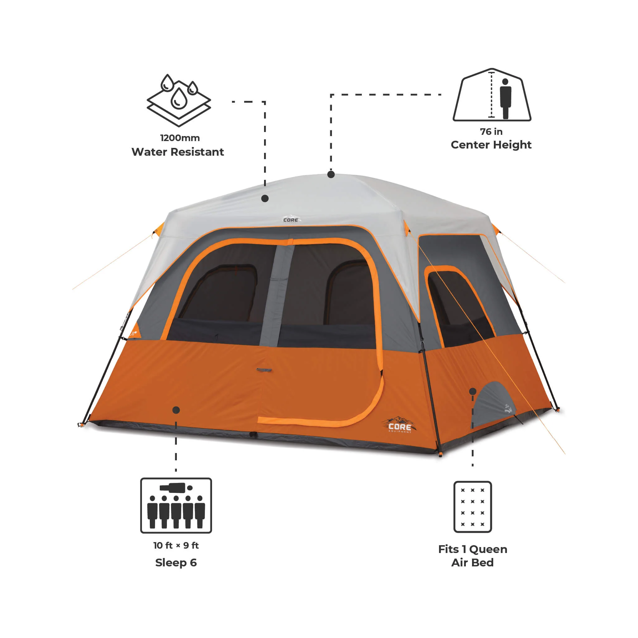 Get camp ready with the 6 Person Straight Wall Cabin Tent. With a straight wall design, the tent creates extra room and usable interior space, making it easier to stand up and move around comfortably. Designed for comfort, the tent features adjustable ventilation, H2O Block weather-ready protection, an electrical port for easy power access, and interior storage to help keep gear organized.