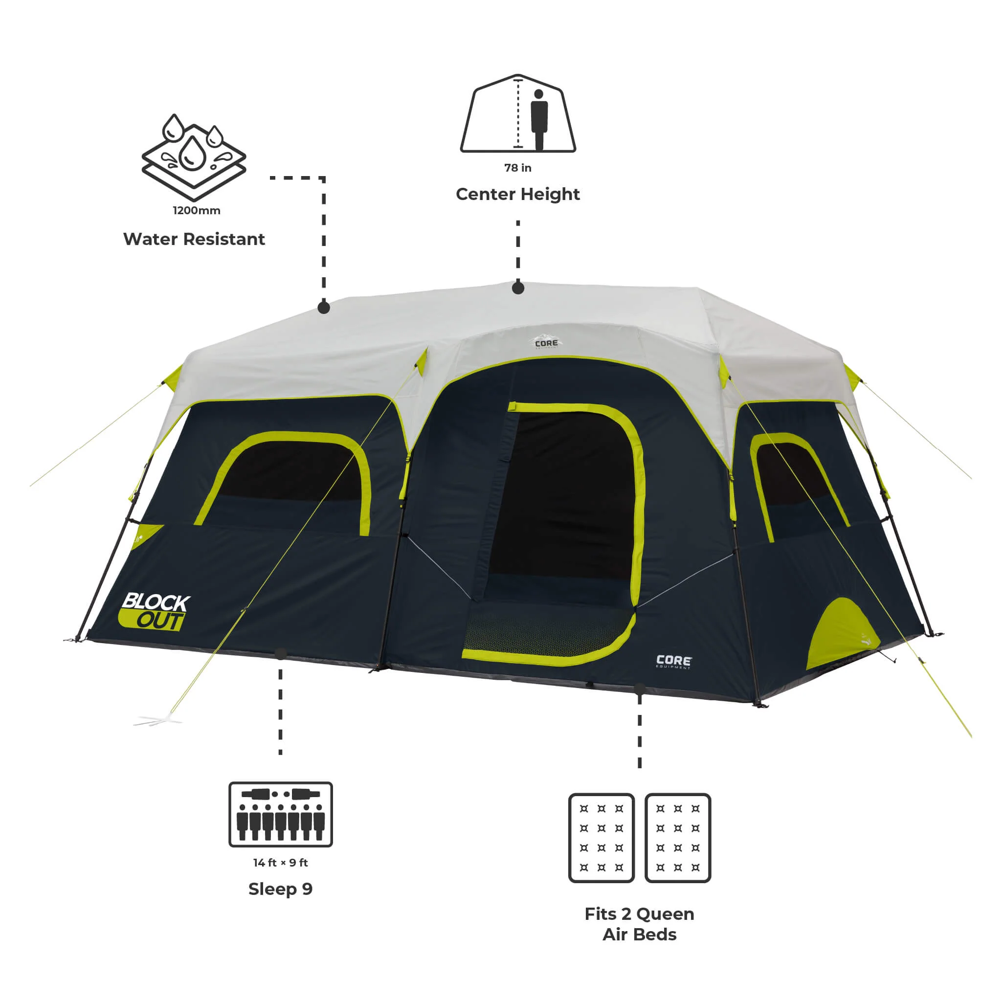 Get to camping faster with the 9 Person Instant Cabin BlockOutâ„¢ Tent. Pre-attached poles make setup quick and easy, with the tent ready in as little as 2 minutes. Just unpack, unfold, and extend the poles while Instant Hub Technology does the rest. Enjoy longer, more comfortable sleep knowing BlockOut Technology blocks up to 90% of sunlight to help keep the sleeping space darker and cooler. Designed for comfort, the tent features adjustable ventilation, H2O Block weather-ready protection, an electrical port for easy power access, interior storage for organization, and a room divider to customize the living space.